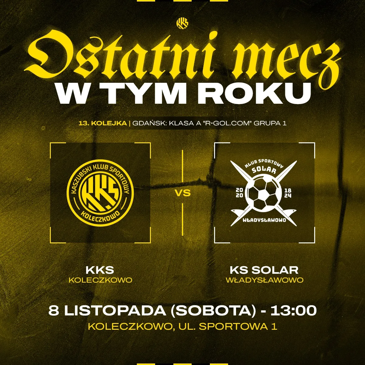 W sobotę, 8 listopada odbył się ostatni w tym roku kalendarzowym mecz drużyny KKS Koleczkowo w ramach 13. kolejki Klasy A R-GOL.COM, Grupa 1. Spotkanie z KS Solar zakończyło się zwycięstwem gospodarzy z wynikiem 3:1.