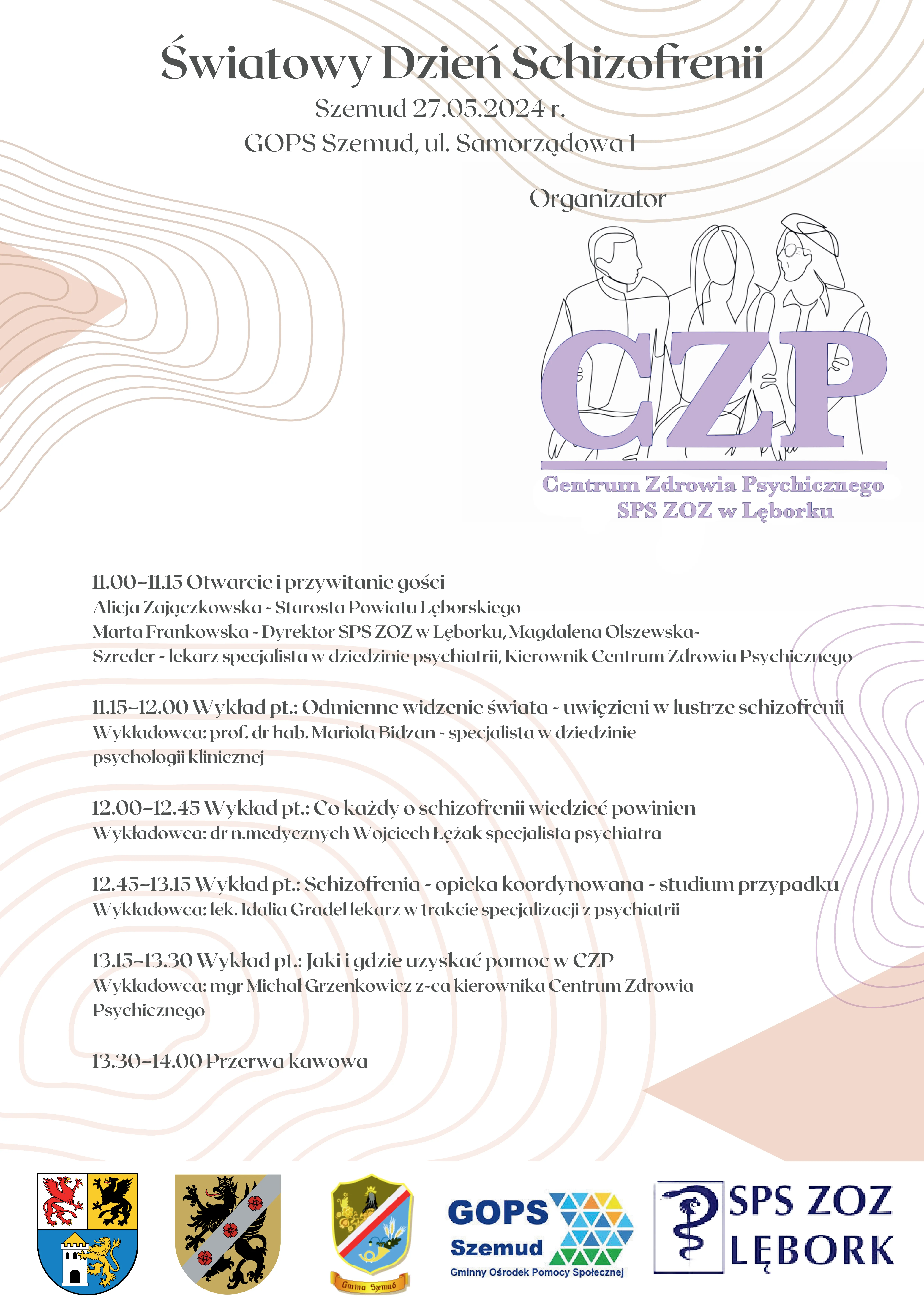 W tym roku 27 maja o godz. 11:00 w Centrum Samorządowym w Szemudzie odbędzie się konferencja z okazji Światowego Dnia Schizofrenii. Organizatorem spotkania jest Starosta Powiatu Lęborskiego oraz Centrum Zdrowia Psychicznego w Lęborku we współpracy z Gminnym Ośrodkiem Pomocy Społecznej w Szemudzie. Będzie to okazja do wysłuchania ciekawych wykładów wybitnych specjalistów w dziedzinie psychiatrii i psychologii.