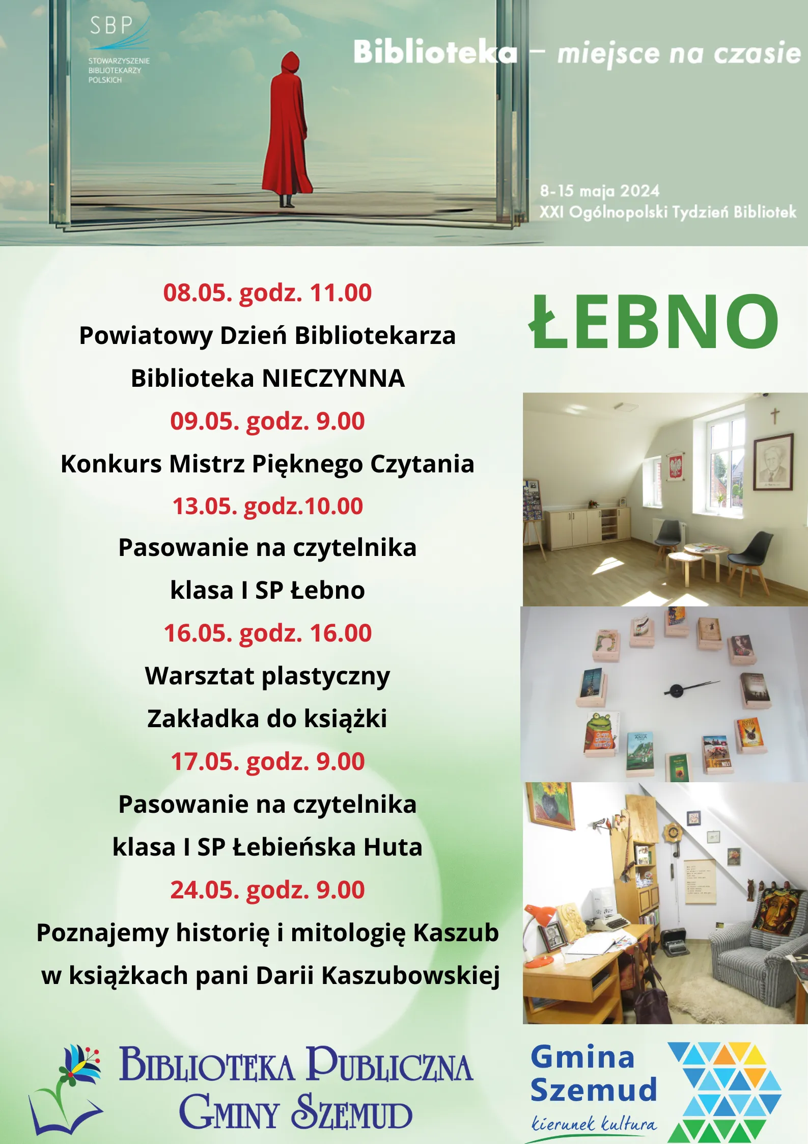 W bibliotekach Gminy Szemud XXI Ogólnopolski Tydzień Bibliotek zaczął się już 6 maja od Konkursu Mistrza Pięknego Czytania w Bojanie, a potrwa do 24 maja spotkaniem z autorką książek o Kaszubach Panią Darią Kaszubowską.