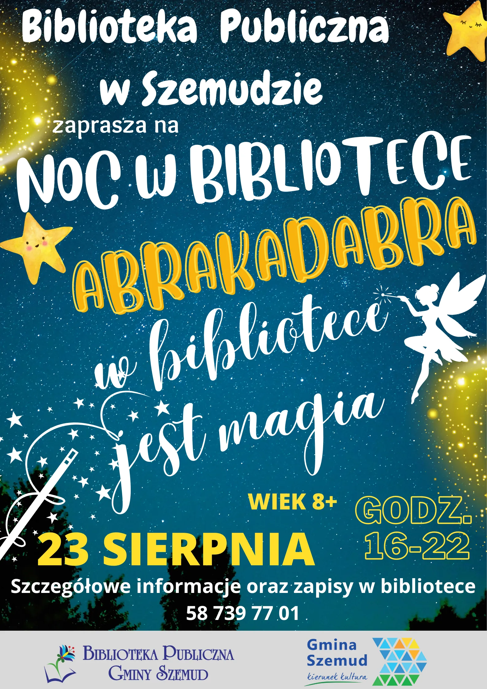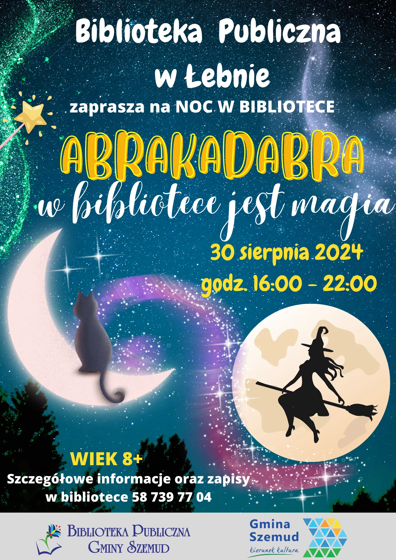 Kolejne atrakcje to Noce w bibliotekach, tym razem pod tytułem "ABRAKADABRA w bibliotece jest magia". Od godziny 16:00 do 22:00 będziemy się bawić w magię, będziemy tworzyć atrybuty czarodzieja. Wszystkie zadania, gry i zabawy będą związane z magią i czarami. Zapisy w poszczególnych bibliotekach Bojano, Kielno, Szemud oraz Łebno. Zapisujemy dzieci od 8 roku życia, spieszmy się ilość miejsc ograniczona.